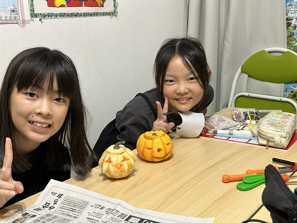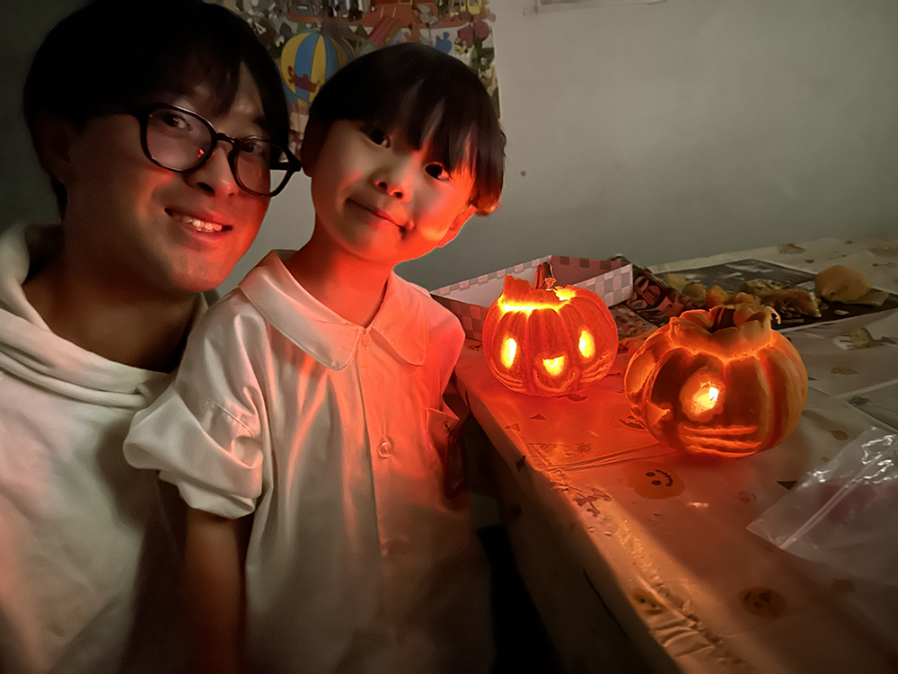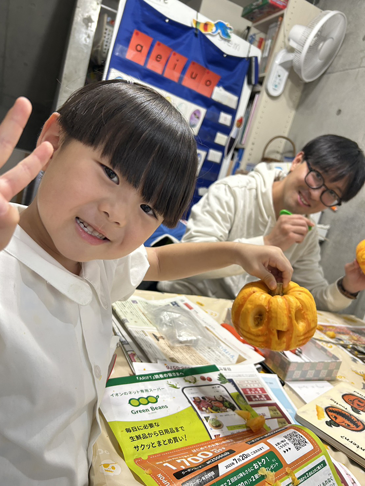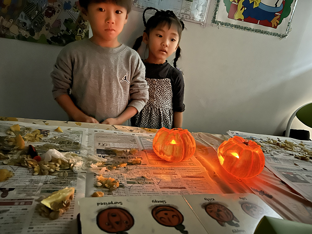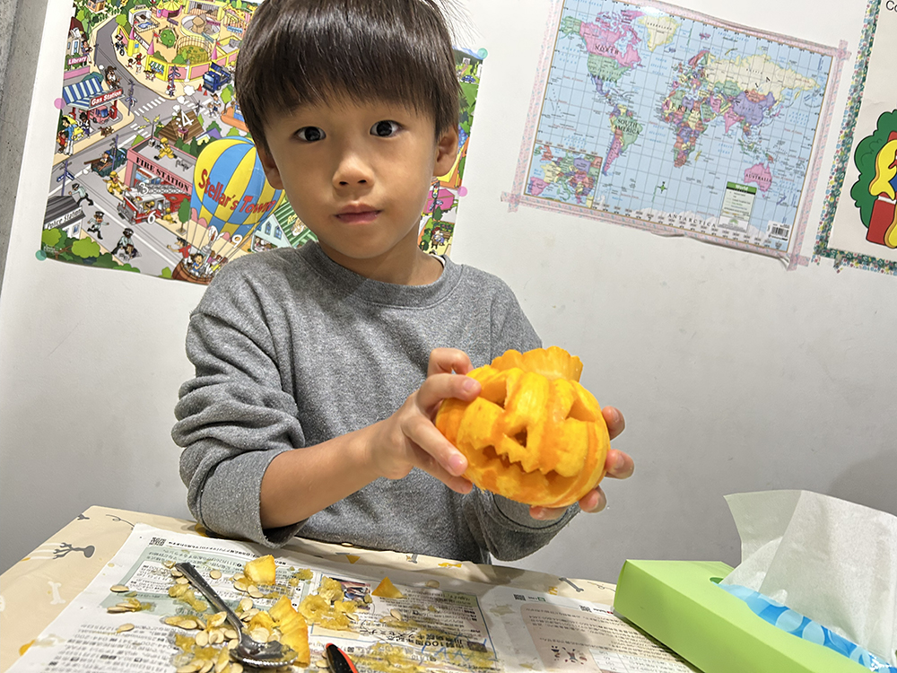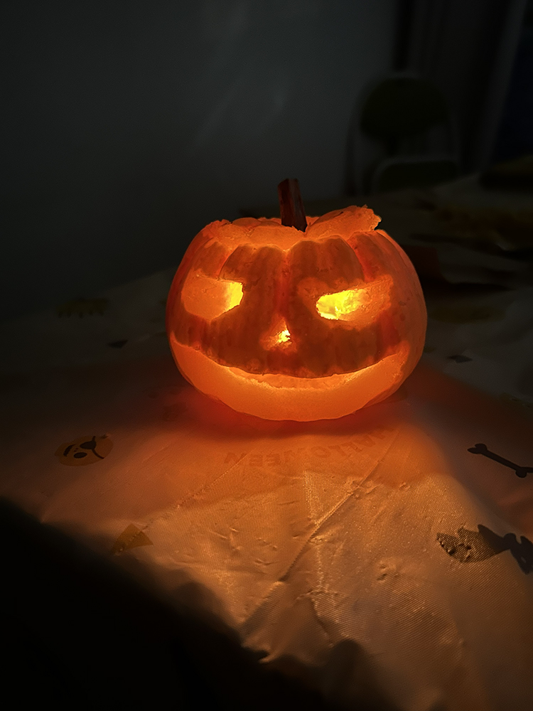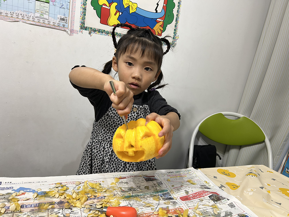 本物のカボチャを彫っています。キャンドルを入れて火をつけるととてもきれいです。