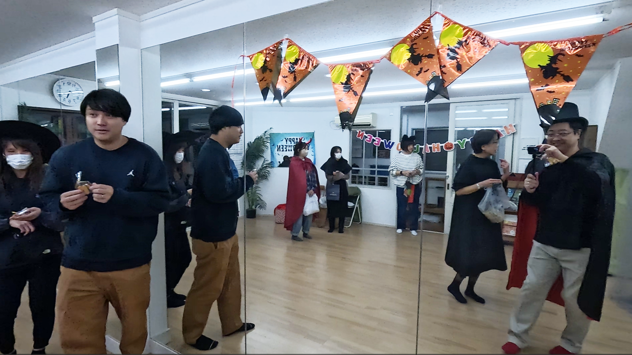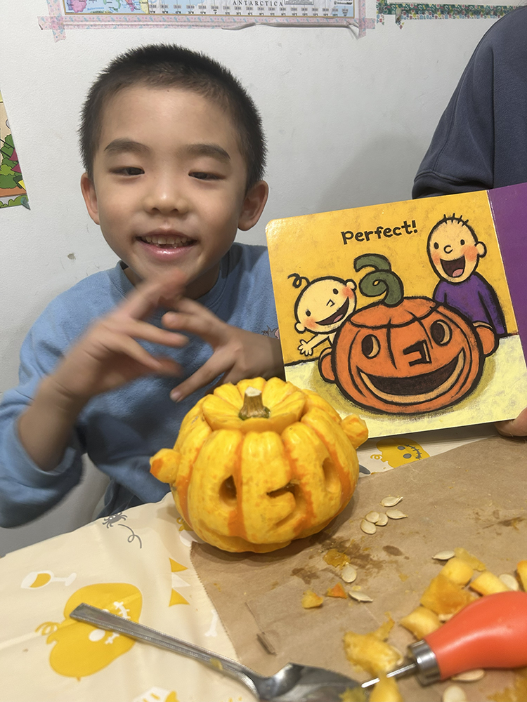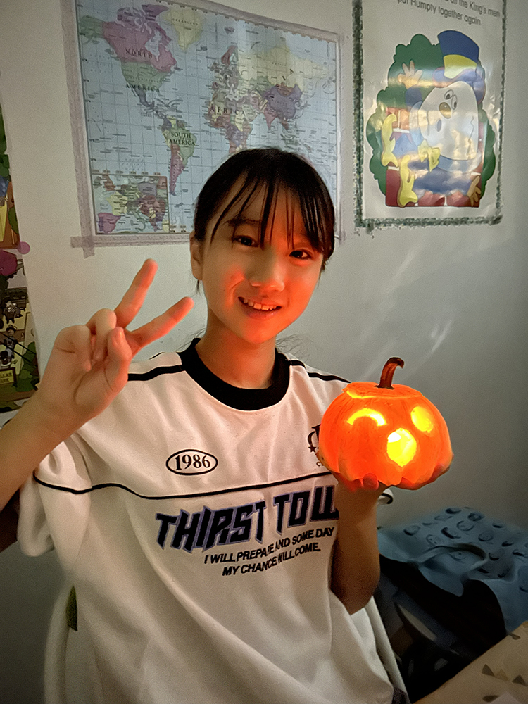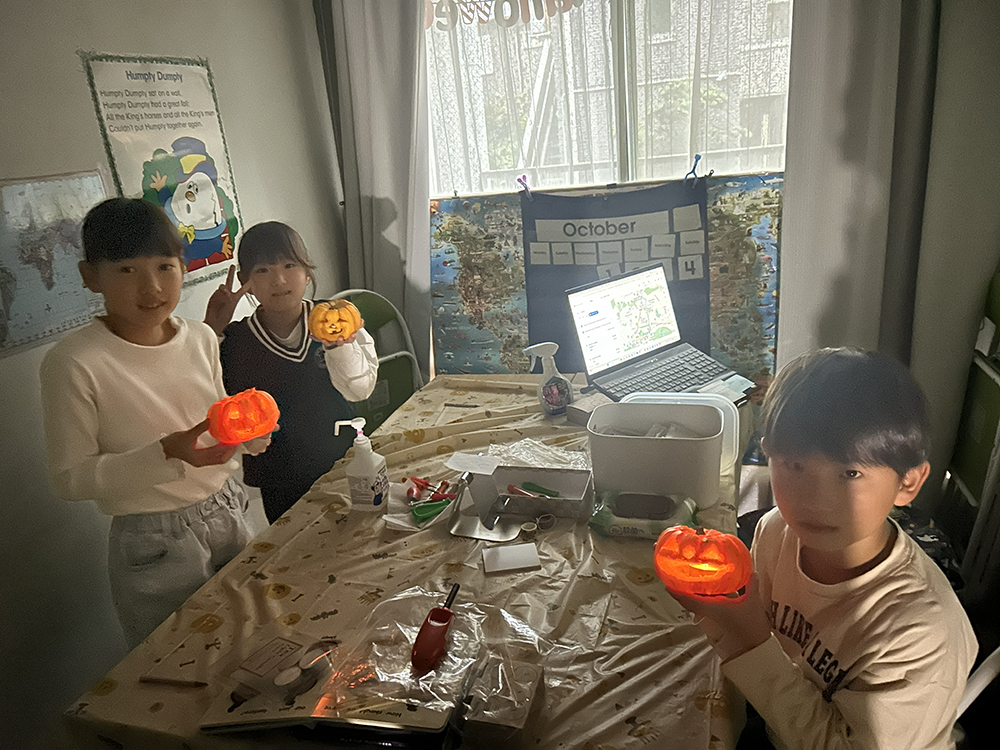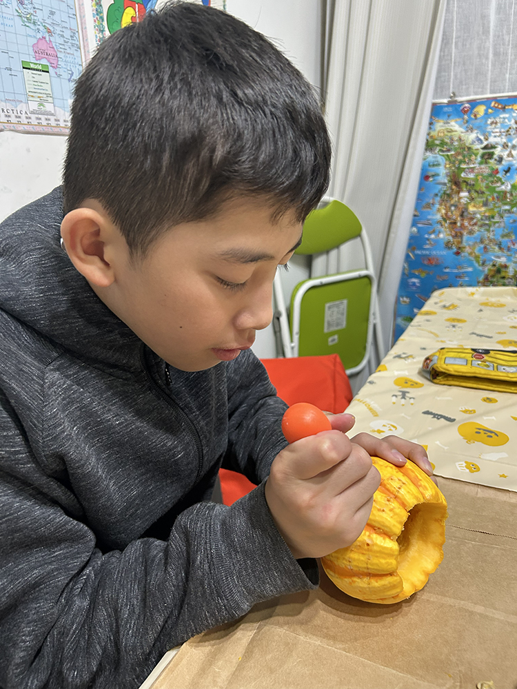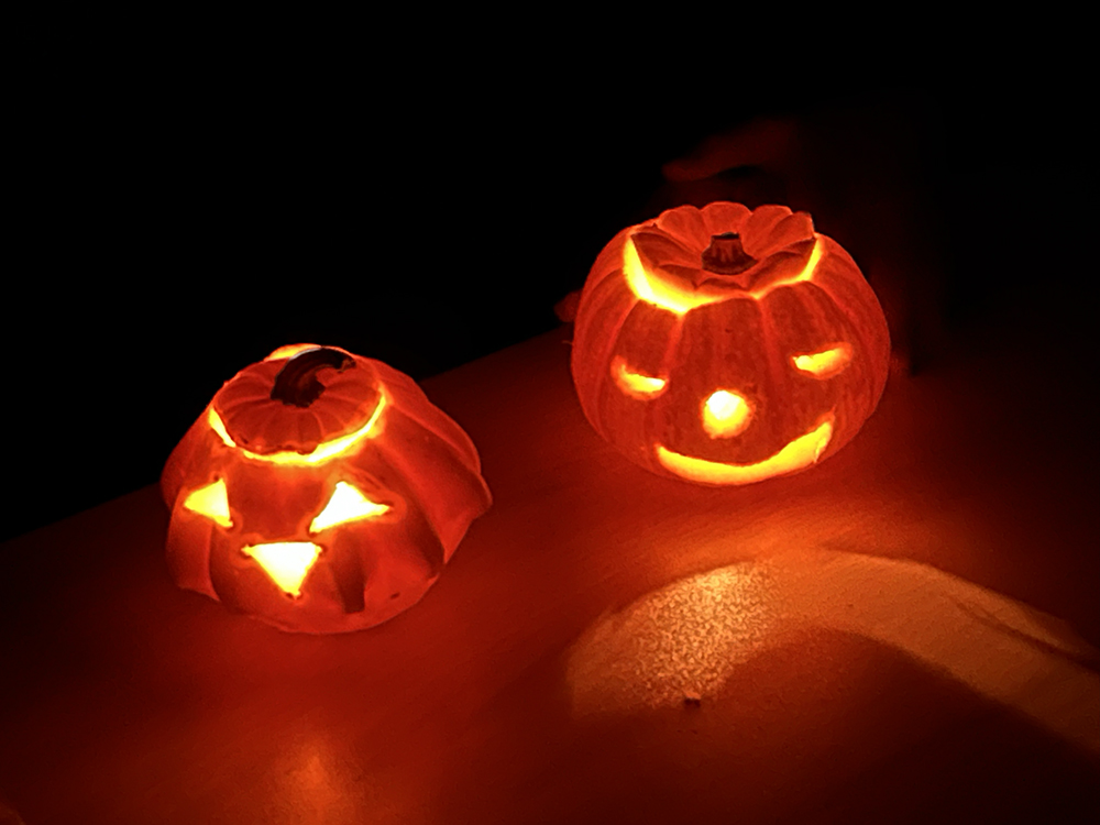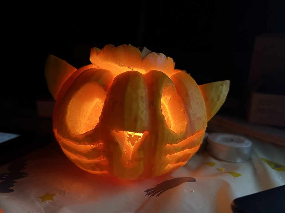 本物のカボチャを彫っています。キャンドルを入れて火をつけるととてもきれいです。